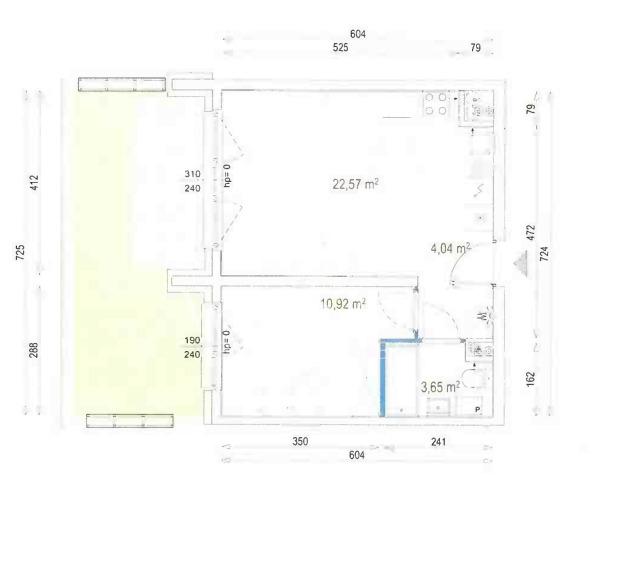 •Układ: 2 pokoje (mieszkanie o nastepujacym układzie: salon z aneksem kuchennym i wyjściem na tarasi ogród : 22,57 m², łazienka o powierzchni 3,65 m², sypialnia 10,92 m²)