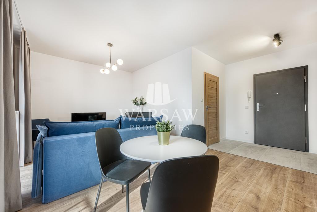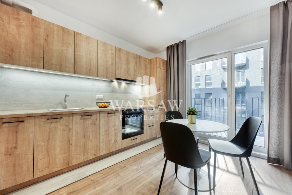 – jasnego pokoju z aneksem kuchennym z wyjściem na balkon – aneks wyposażony w płytę grzewczą, piekarnik, zmywarkę i lodówkę w zabudowie oraz stół z krzesłami