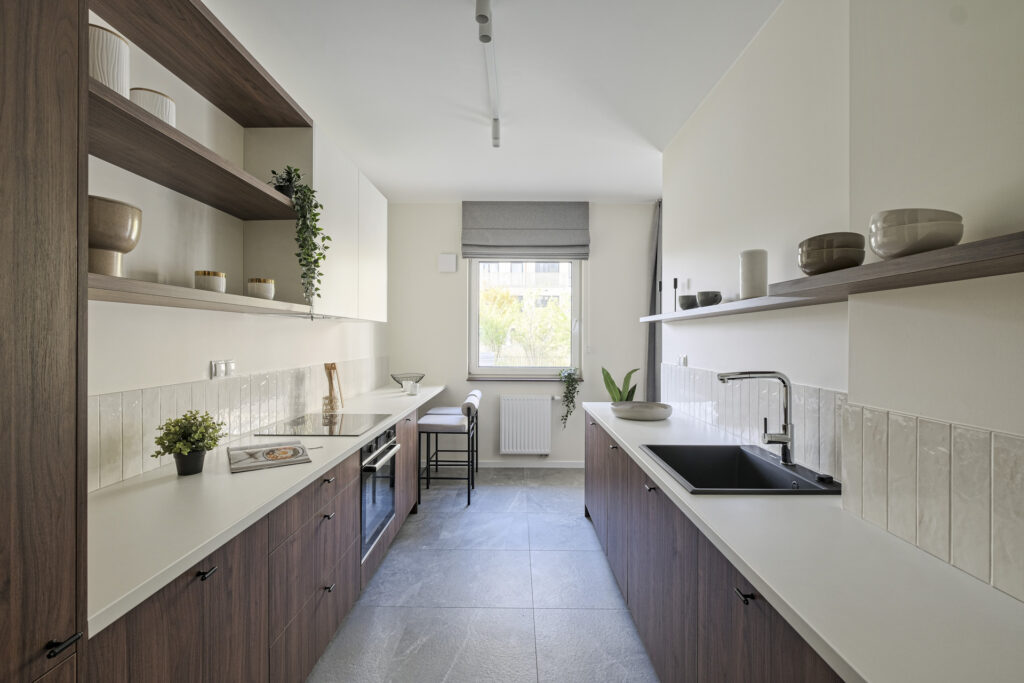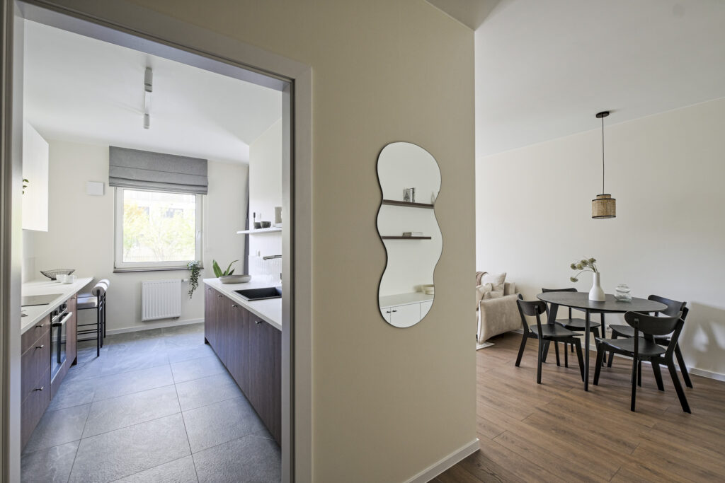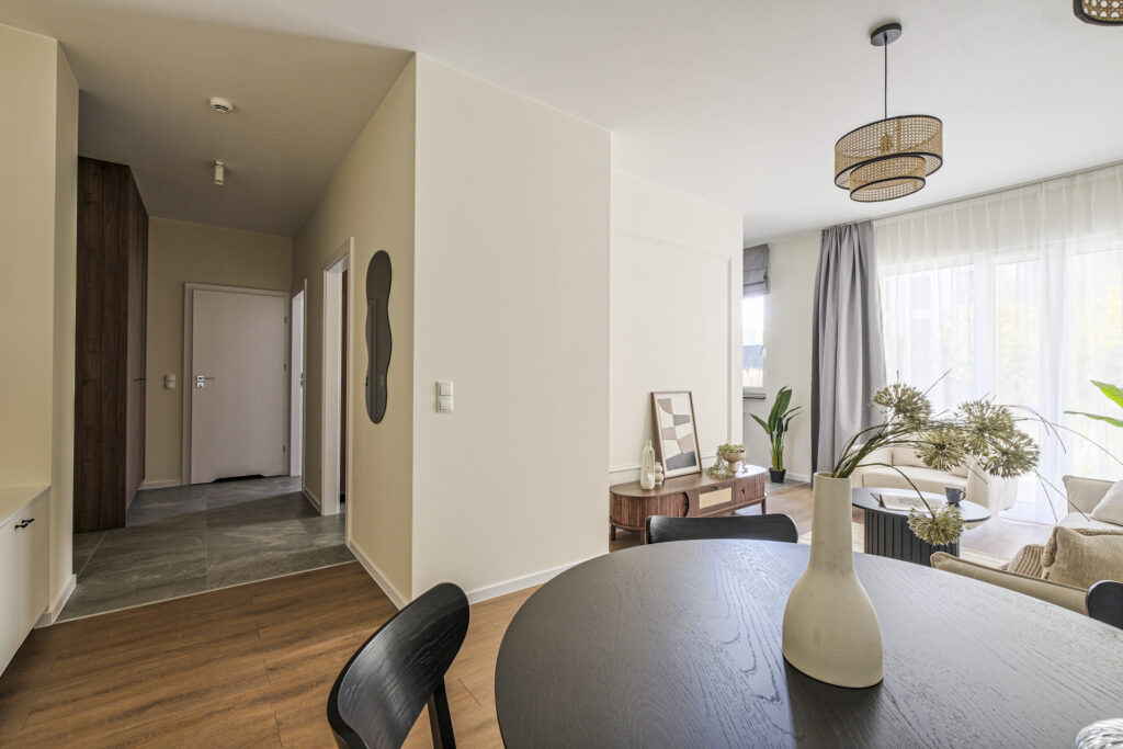 The flat was realised in the Modern Organic finishing package. It is a spacious flat located on the ground floor of a new building, with a separate bedroom, a large living room separated by a half-wall from a comfortable, bright kitchen. There is a bathtub and washing machine in the modern bathroom, and a large wardrobe in the hall. The flat, like others in the development, has large windows with a nice view of the greenery and ponds and a spacious terrace overlooking the green areas of the City Flow development.