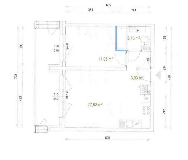 •Layout: 2 rooms (apartment with the following layout: living room with kitchenette and balcony access: 22,82m² , bathroom 3,75m² , bedroom 11,05 m², hall 3,93 m2)
