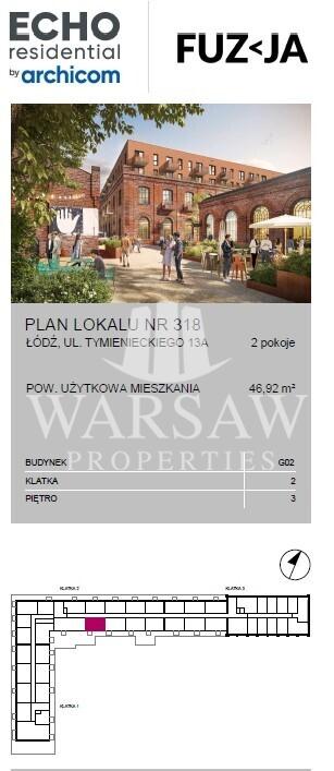 UNIQUE APARTMENTS IN THE OLD PRINTING HOUSE LOFTS AT FUZJI | RESTORED OLD PRINTING HOUSE BUILDING – G2 | NEW CONSTRUCTION | 2 ROOMS WITH BALCONY | 2ND FLOOR | SOUTHWEST EXPOSURE BUILDING: The Old Printing House building is one of the restored buildings included in the Fuzja project. The modern building with a historic facade has all the amenities of a new development – modern staircases, elegant common areas, and elevators. The original walls of the historic buildings have been restored, including the authentic Łódź brick that distinguishes the factory buildings. The cast iron pillars, staircase elements, and window glazing bars have also been restored. The common spaces surrounding the lofts and loft apartments are finished in a minimalist style using concrete, tempered steel, and glass. One interesting solution is the adaptation of cast iron columns that once supported the ceilings, which will now welcome residents and visitors with an original colonnade. ABOUT FUZJA: A unique project consisting of 20 buildings for various purposes, 14 of which are adapted historical buildings. Its heart is the historic Art Nouveau CHP plant and the surrounding square, built on the site of the former Karol Scheibler factory. Modern residential buildings and office buildings have already been completed, including the Łódź offices of Fujitsu Poland Global Delivery Centre. FOR RESIDENTS: Residents' Club, a creative playground for children, Anna's Gardens – a leafy square, and historical details – staircases with original artifacts harking back to the industrial past. – Ecological solutions – Archicom Smart – smart home solutions, a wireless smart home management system. – Archicom Life Services – access to common areas via a smartphone app, parcel pickup point, electric vehicle charging station, recreational areas, and bicycle storage. APARTMENT DESCRIPTION: New, comfortable 2-room apartment, ready to be finished. Bright and quiet, located in building B2 (on Tymienieckiego Street) on the 2nd floor, with a balcony facing southwest (overlooking Fuzja). The apartment consists of: – a bright living room with a kitchenette and large windows leading to a balcony (23.85 m2) – a separate bedroom (15.08 m2) – a bathroom (4.36 m2) – a hallway (3.63 m2) – a balcony (3.4 m2). The apartment is in developer's standard. Window exposure faces southwest. CALL and inquire about other apartments in Fuzja. We offer apartments with loft windows on the ground floor with gardens, 2-level apartments (overlooking a private area reserved for residents), and modern 1-, 2-, and 3-room apartments on the upper floors. Call and inquire about available apartments. All apartments are ready for collection, keys are available at the agency. As a real estate agency, we charge a commission for our services. This announcement is for informational purposes only and does not constitute an offer within the meaning of Article 66 § 1 of the Civil Code. ESTATE: Fuzja is a new urban space conducive to living, working, and relaxing. The project consists of four residential buildings with over 600 units, as well as offices with a total area of approximately 40,000 square meters. The historic buildings also include space for services, shops, and restaurants. New public squares, common spaces, and green areas cover almost 4 hectares. Residents and users of Fuzja can take advantage of numerous amenities, including car-sharing services, bike paths, bicycle service stations, parcel lockers, and electric chargers. All this makes Fuzja, a carefully planned and exceptional development, a unique place on the map of Łódź, attractive to residents and tourists.