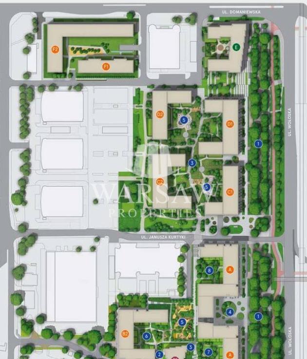 Сучасна 2-кімнатна квартира в престижному інвестиційному комплексі Modern Mokotow – Варшава | 42,05 м² | ВУЛИЦЯ ДОМАНЄВСЬКА – СЛУЖЕВЕЦЬ| БАЛКОН І МІСЦЕ ДЛЯ ПОСТАВКИ До продажу пропонується квартира в стані від забудовника в сучасному інвестиційному комплексі Modern Mokotow, авторитетного забудовника, розташованому на вулиці Доманевської. Це ідеальне місце для людей, які цінують комфорт проживання в самому центрі Мокотова – з швидким доступом до роботи, магазинів, розваг та транспорту. Інвестиція була розроблена з урахуванням комфорту та естетики, з великою кількістю зелені навколо маєтку.Опис квартири: -Адреса: вулиця Доманевська / Постенпу / Будівля F2 – Сучасний Мокотув, Служевець -Метрична площа: 42,05 м² -Площадь: 42,05 м² -Планування: 2 кімнати (квартира з наступним плануванням: вітальня з міні-кухнею та виходом на балкон: 22,56 м², ванна кімната 3,75 м², спальня 10,42 м², хол 5,32) – Поверх: 2/10 (з ліфтом) – Велика сонячна тераса – Вікна та балкони виходять на південь, внутрішній дворик, тиша і спокій – Стан: забудовник – повна свобода облаштування інтер’єру відповідно до власних потреб – Місце для паркування: в підземному гаражі, додатково оплачується 50 000 злотих.