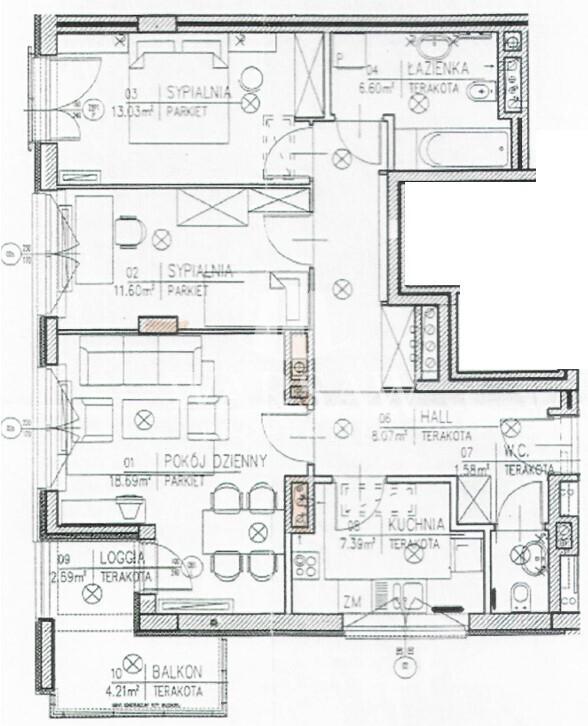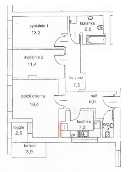 – The apartment consists of a spacious living room (18.69 m2) with access to a 4.21 m2 balcony, a separate, bright kitchen (7.39 m2), two bedrooms (11.8 m2 and 13m2), a bathroom with a bathtub and shower set and a washing machine (6.6 m2), a separate toilet (1.5 m2) and a hall (8.36 m2) with a built-in wardrobe. Currently the apartment is unfurnished.