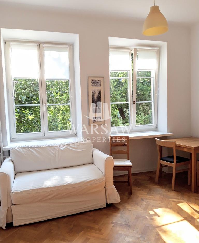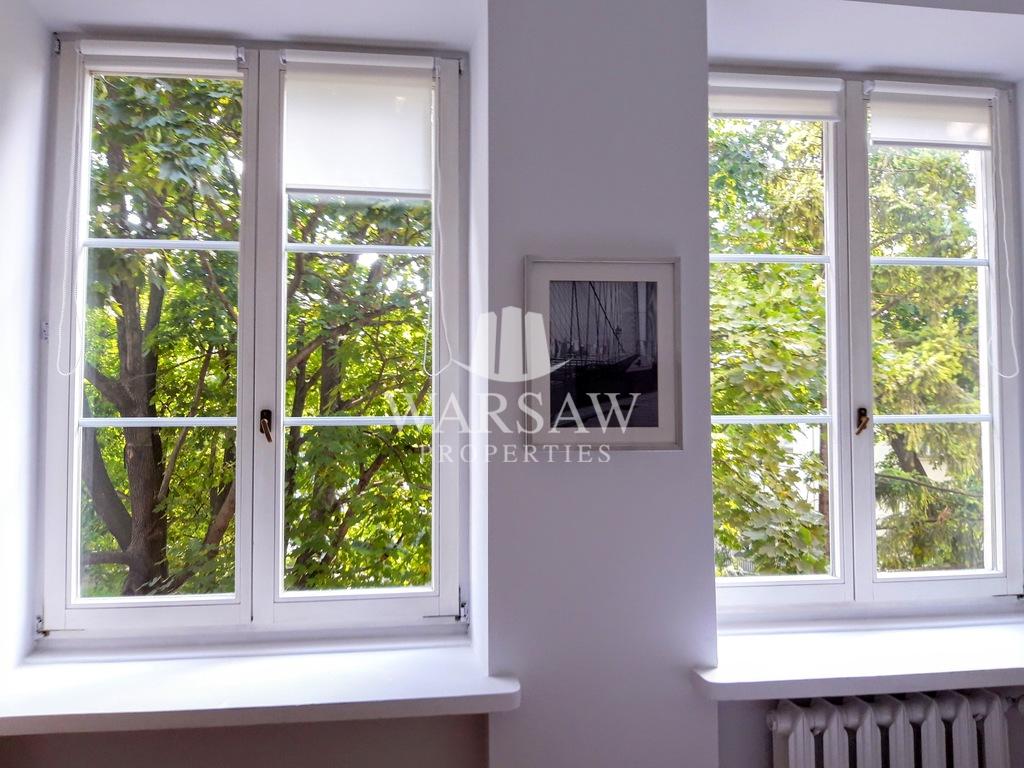 Mieszkanie ma 4 duże okna wychodzące na zabytkowy skwer porośnięty wysokim drzewami. Wyjątkowy klimat mieszkania dopełnia widok na tereny zielone.