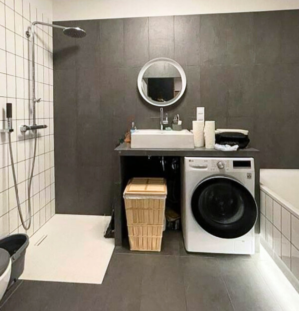 – Łazienka: duży prysznic bez barier architektonicznych, umywalka, wc, pralka